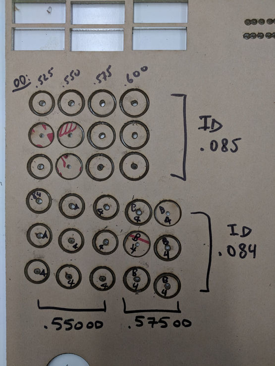 I laser cut the wheels from a sheet of 1/8" acrylic. I experimented with the outer and inner diameters to determine what the ideal fit was given the laser cutter's kerf. I also experimented with double-width wheels in the front to account for the empty space where a real buggy's spindle and brakes would go. The double wheels worked better, so I made a set of them simply using superglue while keeping the center holes aligned on a nail. The wheels rotated around static axles. The front wheels were kept in place by the end caps from the derby kit and the rear wheel was kept in place by the rear fairing.