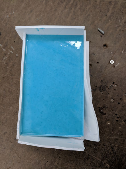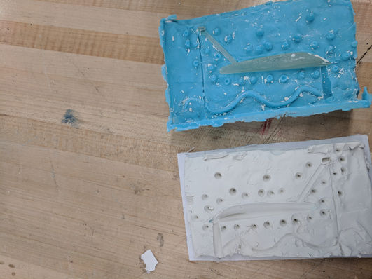 I mixed the silicone formula and poured it into the box. Once the first silicone mold solidified, this process was repeated for the other half of the mold.